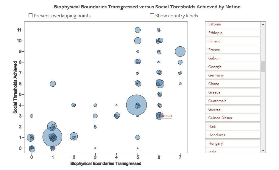 «Βρήκαμε», πρόσθεσε, «ότι οι βασικές ανάγκες όπως η διατροφή, η υγεινή και η εξάλειψη της υπερβολικής φτώχειας πιθανότατα μπορούν να επιτευχθούν σε όλες τις χώρες, χωρίς να υπερβούν τα παγκόσμια περιβαλλοντικά όρια. Δυστυχώς δεν συμβαίνει το ίδιο με τους άλλους κοινωνικούς στόχους, που πάνε πέρα από τη βασική επιβίωση, όπως η εκπαίδευση και η υψηλή ικανοποίηση στη ζωή. Η ικανοποίηση αυτών των στόχων μπορεί να απαιτήσει ένα επίπεδο χρήσης πόρων, που ξεπερνά κατά δύο έως έξι φορές το βιώσιμο επίπεδο». «Σε γενικές γραμμές, όσα περισσότερα κοινωνικά ”κατώφλια” περνάει μια χώρα, τόσο περισσότερο υπερβαίνει τα πλανητικά όρια και το αντίστροφο», δήλωσε ο ερευνητής δρ Ουίλιαμ Λαμπ του Ινστιτούτου Ερευνών Mercator.