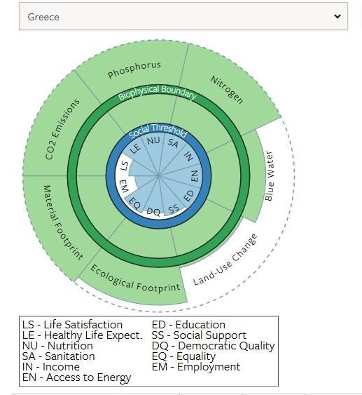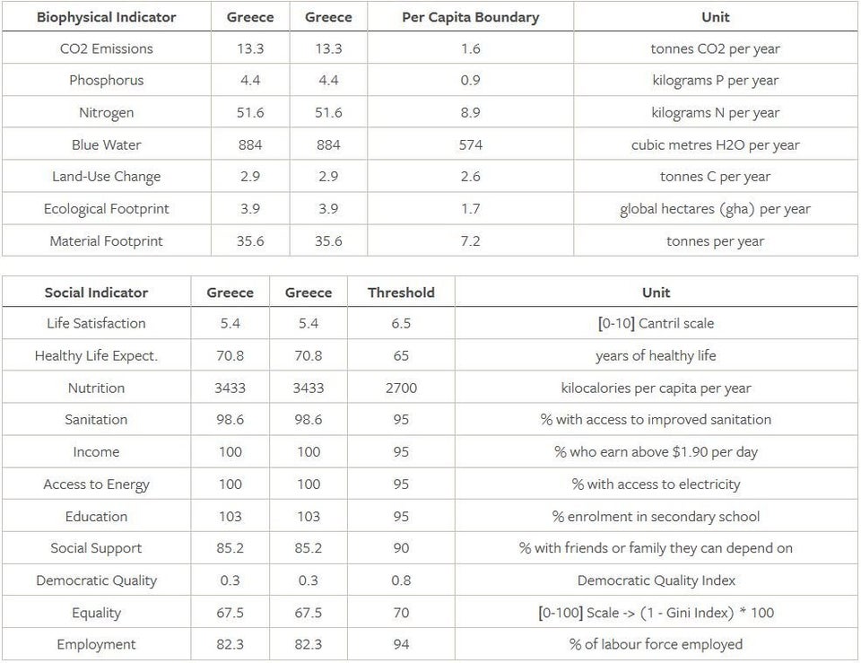 Οι έξι κοινωνικοί δείκτες για τους οποίους η Ελλάδα εμφανίζεται να έχει ξεπεράσει το κατώφλι της ικανοποίησής τους, είναι οι εξής: προσδόκιμο υγιούς ζωής (70,8 έτη στην Ελλάδα έναντι ορίου 65 ετών), κατανάλωση θερμίδων ανά άτομο ετησίως (η χώρα μας έχει 3.433 έναντι ορίου 2.700 θερμίδων), πρόσβαση πληθυσμού σε βελτιωμένες συνθήκες υγιεινής (η χώρα μας έχει ποσοστό 98,6% με όριο το 95%), εισόδημα (το 100% στην Ελλάδα κερδίζουν πάνω από 1,90 δολάρια τη μέρα, με όριο το 95%), πρόσβαση στην ηλεκτρική ενέργεια (100% στην Ελλάδα, με όριο το 95%) και πρόσβαση στη δευτεροβάθμια εκπαίδευση (100% στη χώρα μας, με όριο το 95%).