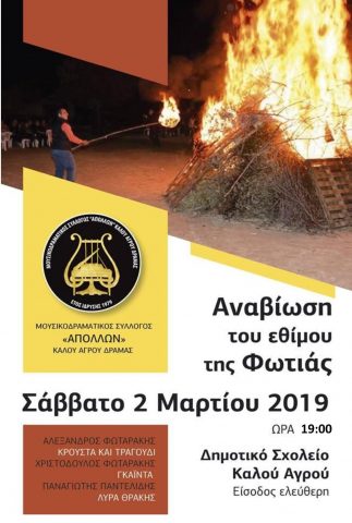 Ο Μουσικοδραματικός Σύλλογος «Απόλλων» Καλού Αγρού σας προσκαλεί το Σάββατο 2 Μαρτίου 2019 στις 7 το απόγευμα στο Δημοτικό Σχολείο Καλού Αγρού στην αναβίωση του εθίμου της φωτιάς
