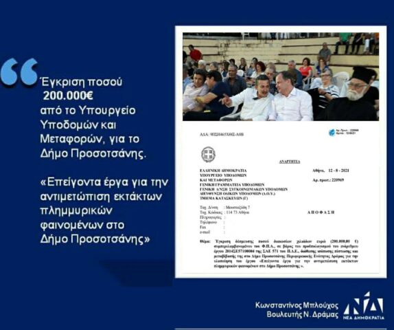 Εγκρίθηκε από το Υπουργείο Υποδομών και Μεταφορών, χρηματοδότηση ύψους 200.000 € για την υλοποίηση έργου σχετικού με την αντιμετώπιση εκτάκτων πλημμυρικών φαινομένων στο Δήμο Προσοτσάνης.