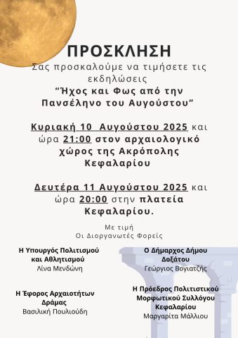 Πρόγραμμα για τις διήμερες εκδηλώσεις με τίτλο: «Ήχος και φως από την Πανσέληνο του Αυγούστου» που θα πραγματοποιηθούν στην Ακρόπολη Κεφαλαρίου και στην Κεντρική Πλατεία Κεφαλαρίου του Δήμου Δοξάτου στις 9 και 10 Αυγούστου.