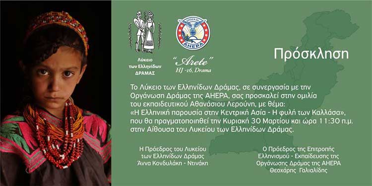 Το λύκειο Ελληνίδων Δράμας σε συνεργασία με την οργάνωση Δράμας της ΑΗΕΡΑ, σας προσκαλεί στην ομιλία του εκπαιδευτικού Αθανασίου Λερούνη με θέμα: “Η Ελληνική παρουσία στην Κεντρική Ασία- Η φυλή των Καλλάσα” που θα πραγματοποιηθεί την Κυριακή 30 Μαρτίου 2014 και ώρα 11,30 π.μ. στην αίθουσα του Λυκείου Ελληνίδων Δράμας.